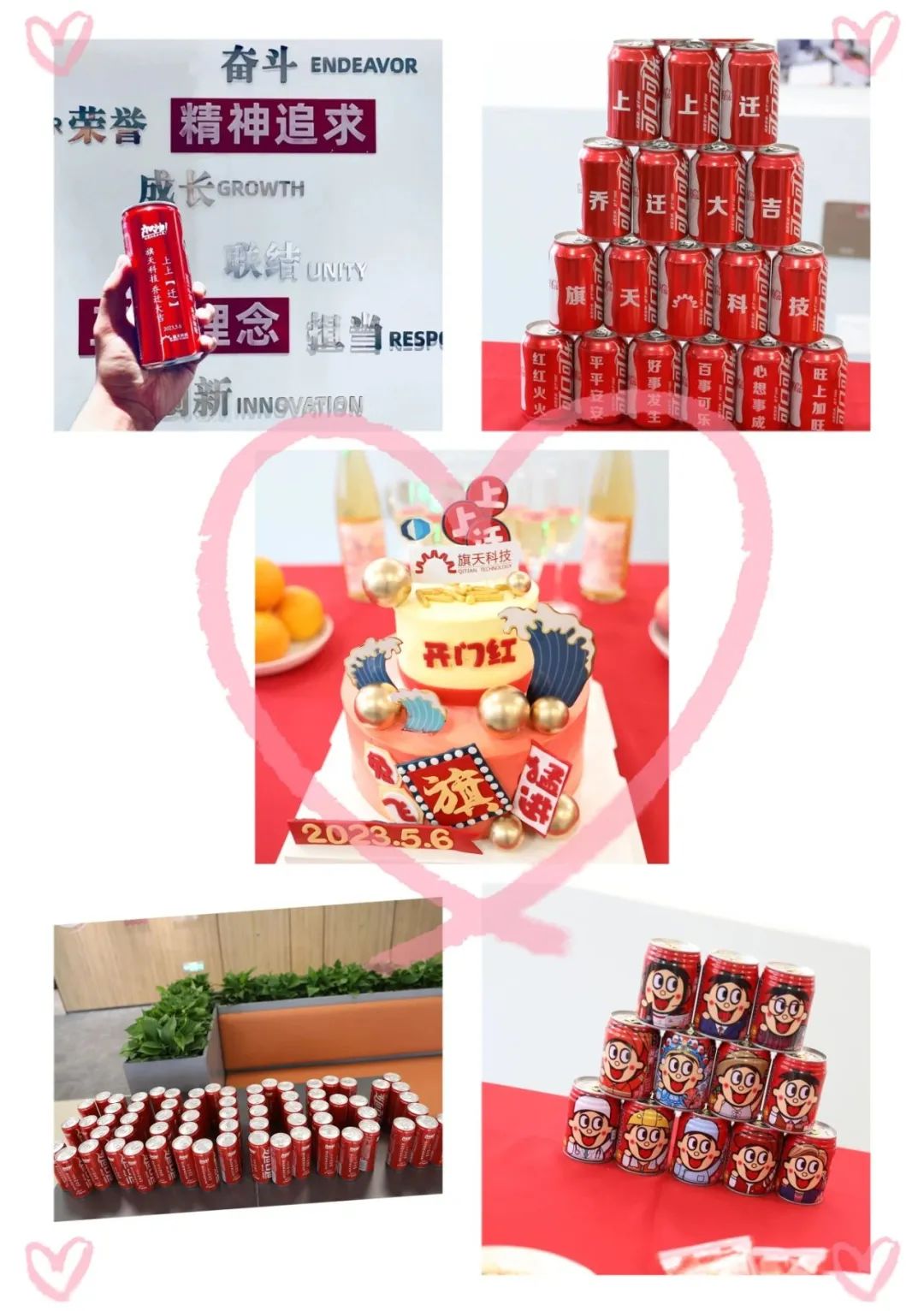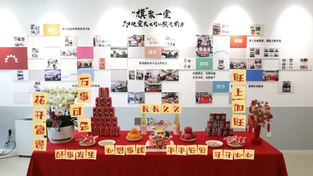 整面墙Slogan醒目的贴合活动主题——“旗”聚一堂,即便是萤火,也可以照亮前方!长桌上布满了集团各部门为小旗开业仪式送上真挚的心意。分别蕴含着“花开富贵”、“万事可乐”、“心想事成”、“好事发生”、“平平安安”、“长长久久”、“开开心心”、“旺上加旺”,让我们一起举杯庆祝,分享甜蜜的祝福。